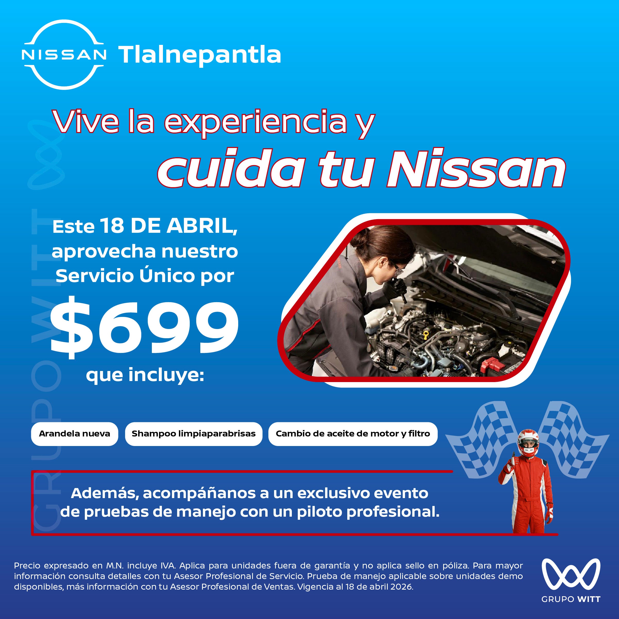 Precio expresado en M.N. incluye IVA. Aplica para unidades fuera de garantía y no aplica sello en póliza. Para mayor información consulta detalles con tu Asesor Profesional de Servicio. Prueba de manejo aplicable sobre unidades demo disponibles, más información con tu Asesor Profesional de Ventas. Vigencia al 18 de abril 2026.