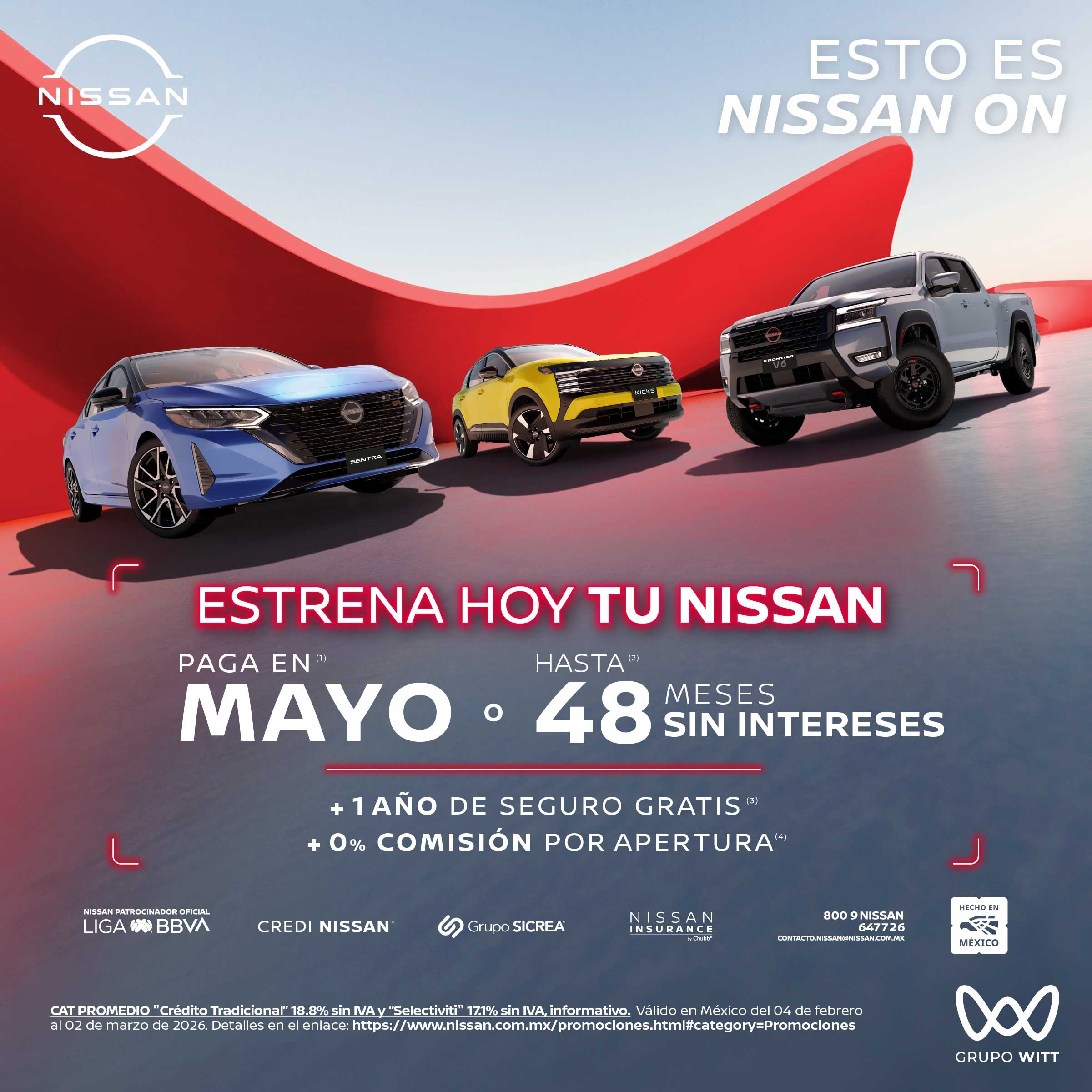 CAT PROMEDIO "Crédito Tradicional" 18.8% sin IVA y "Selectiviti" 17.1% sin IVA, informativo. Válido en México del 04 de febrero al 02 de marzo de 2026. Detalles en el enlace: https://www.nissan.com.mx/promociones.html#category=Promociones
