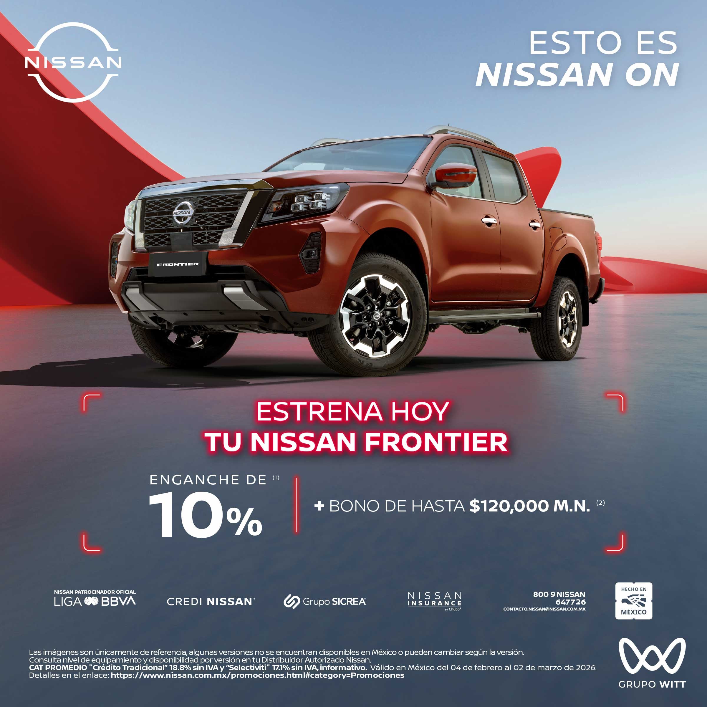 Las imágenes son únicamente de referencia, algunas versiones no se encuentran disponibles en México o pueden cambiar según la versión. Consulta nivel de equipamiento y disponibilidad por versión en tu Distribuidor Autorizado Nissan. CAT PROMEDIO "Crédito Tradicional" 18.8% sin IVA y "Selectiviti" 171% sin IVA, informativo. Válido en México del 04 de febrero al 02 de marzo de 2026. Detalles en el enlace: https://www.nissan.com.mx/promociones.html#category=Promociones