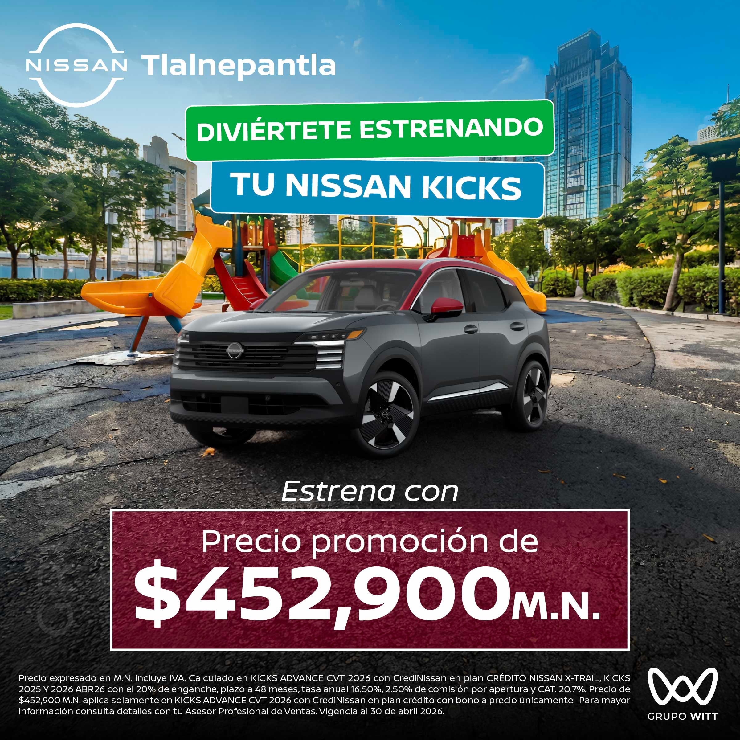 Precio expresado en M.N. incluye IVA. Calculado en KICKS ADVANCE CVT 2026 con CrediNissan en plan CRÉDITO NISSAN X-TRAIL, KICKS 2025 Y 2026 ABR26 con el 20% de enganche, plazo a 48 meses, tasa anual 16.50%, 2.50% de comisión por apertura y CAT. 20.7%. Precio de $452,900 M.N. aplica solamente en KICKS ADVANCE CVT 2026 con CrediNissan en plan crédito con bono a precio únicamente. Para mayor información consulta detalles con tu Asesor Profesional de Ventas. Vigencia al 30 de abril 2026.
