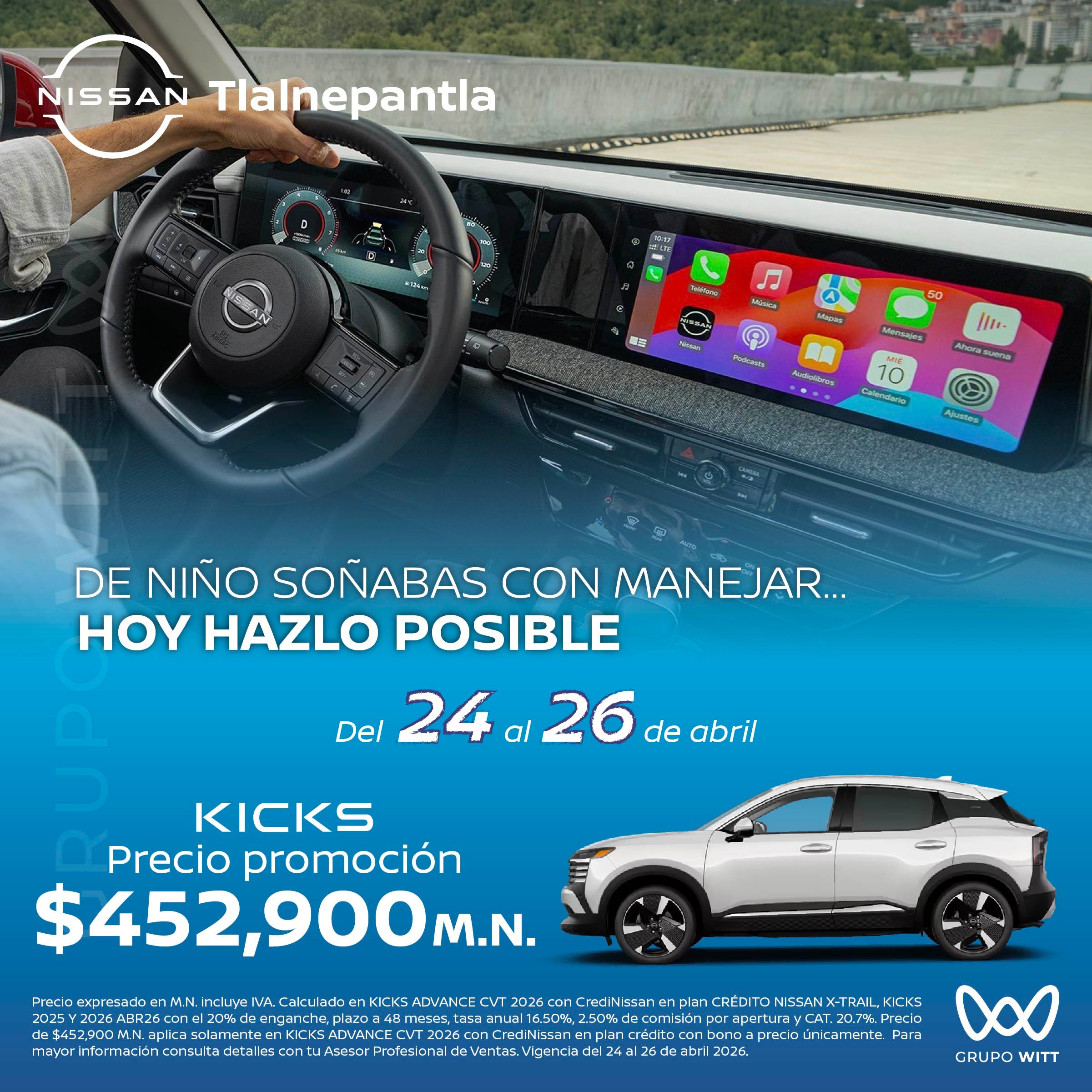 Precio expresado en M.N. incluye IVA. Calculado en KICKS ADVANCE CVT 2026 con CrediNissan en plan CRÉDITO NISSAN X-TRAIL, KICKS 2025 Y 2026 ABR26 con el 20% de enganche, plazo a 48 meses, tasa anual 16.50%, 2.50% de comisión por apertura y CAT. 20.7%. Precio de $452,900 M.N. aplica solamente en KICKS ADVANCE CVT 2026 con CrediNissan en plan crédito con bono a precio únicamente. Para mayor información consulta detalles con tu Asesor Profesional de Ventas. Vigencia del 24 al 26 de abril 2026.
