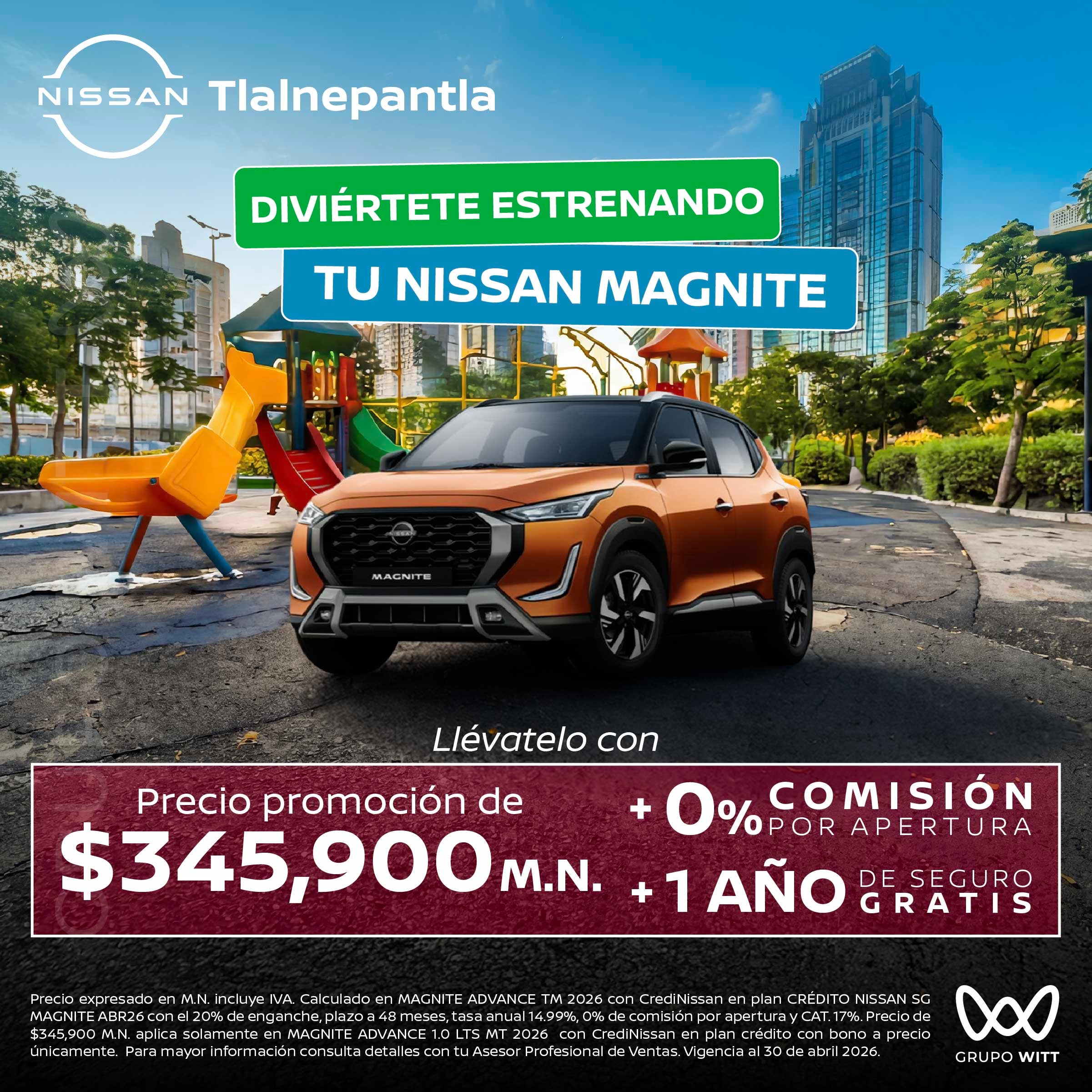 Precio expresado en M.N. incluye IVA. Calculado en MAGNITE ADVANCE TM 2026 con CrediNissan en plan CRÉDITO NISSAN SG MAGNITE ABR26 con el 20% de enganche, plazo a 48 meses, tasa anual 14.99%, 0% de comisión por apertura y CAT.17%. Precio de $345,900 M.N. aplica solamente en MAGNITE ADVANCE 1.0 LTS MT 2026 con CrediNissan en plan crédito con bono a precio únicamente. Para mayor información consulta detalles con tu Asesor Profesional de Ventas. Vigencia al 30 de abril 2026.