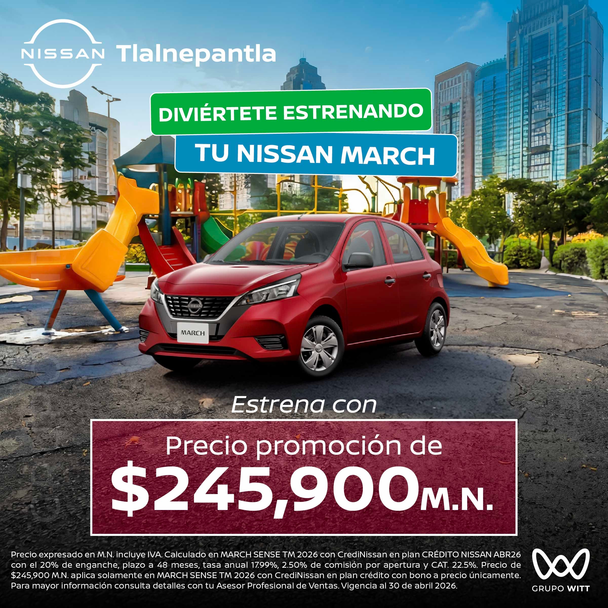 Precio expresado en M.N. incluye IVA. Calculado en MARCH SENSE TM 2026 con CrediNissan en plan CREDITO NISSAN ABR26 con el 20% de enganche, plazo a 48 meses, tasa anual 17.99%, 2.50% de comisión por apertura y CAT. 22.5%. Precio de $245,900 M.N. aplica solamente en MARCH SENSE TM 2026 con CrediNissan en plan crédito con bono a precio únicamente. Para mayor información consulta detalles con tu Asesor Profesional de Ventas. Vigencia al 30 de abril 2026.