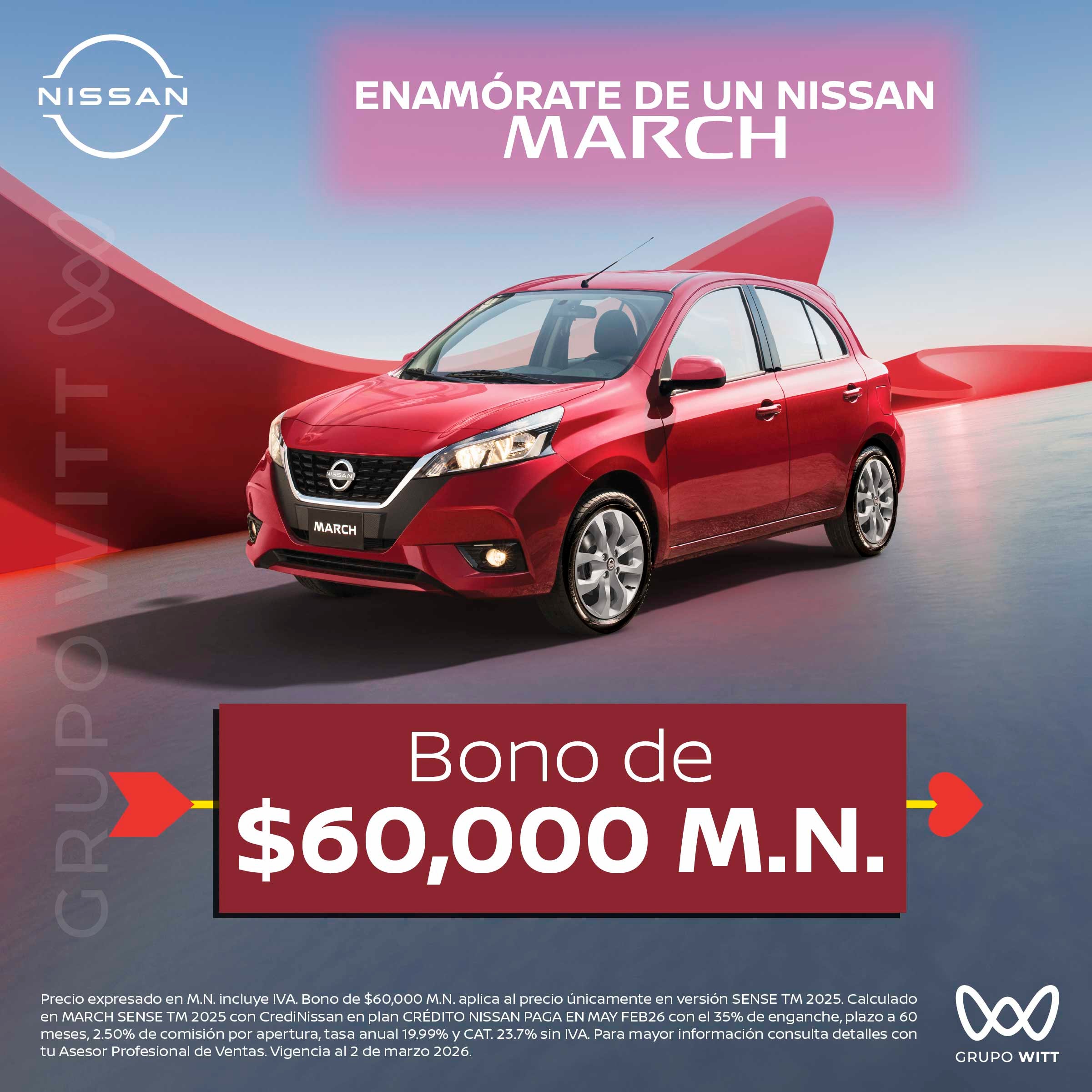 Precio expresado en M.N. incluye IVA. Bono de $60,000 M.N. aplica al precio únicamente en versión SENSE TM 2025. Calculado en MARCH SENSE TM 2025 con CrediNissan en plan CRÉDITO NISSAN PAGA EN MAY FEB26 con el 35% de enganche, plazo a 60 meses, 2.50% de comisión por apertura, tasa anual 19.99% y CAT. 23.7% sin IVA. Para mayor información consulta detalles con tu Asesor Profesional de Ventas. Vigencia al 2 de marzo 2026.