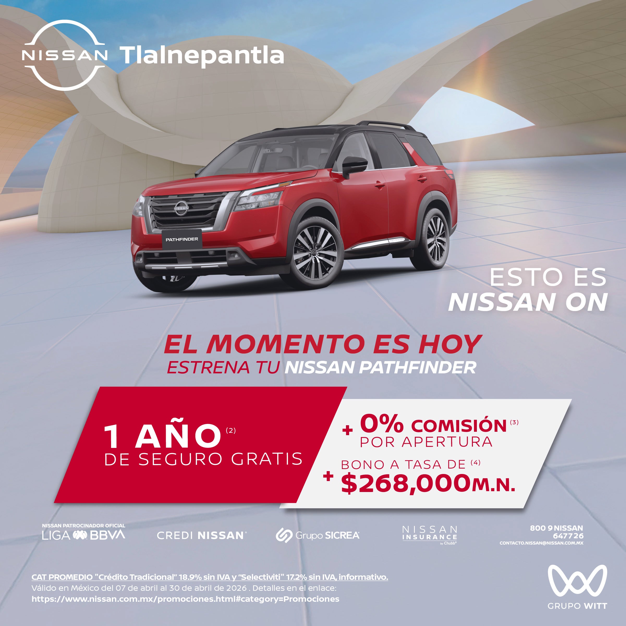 CAT PROMEDIO "Crédito Tradicional" 18.9% sin IVA y "Selectiviti" 17.2% sin IVA, informativo. Válido en México del 07 de abril al 30 de abril de 2026 . Detalles en el enlace: https://www.nissan.com.mx/promociones.html#category=Promociones