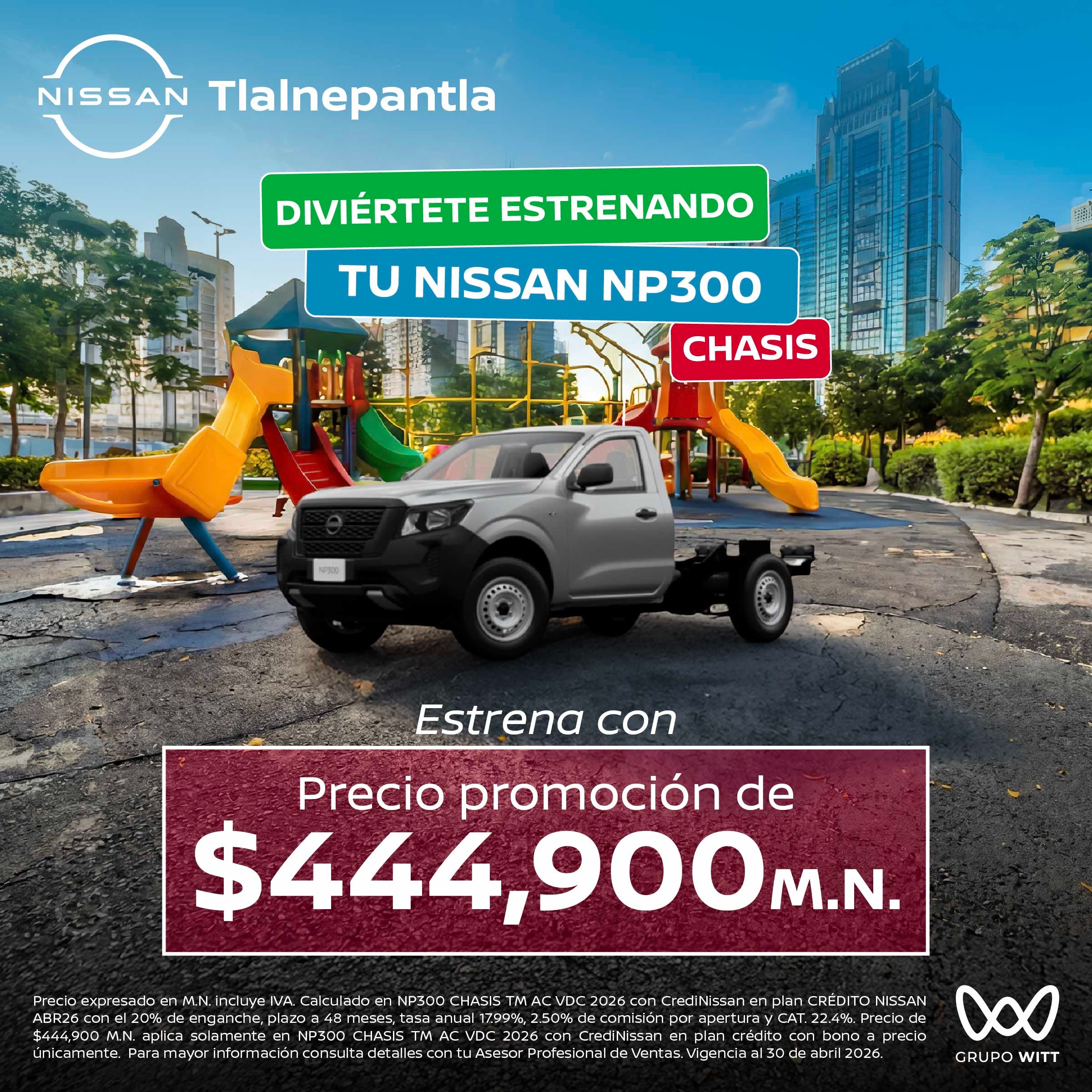 Precio expresado en M.N. incluye IVA. Calculado en NP300 CHASIS TM AC VDC 2026 con CrediNissan en plan CRÉDITO NISSAN ABR26 con el 20% de enganche, plazo a 48 meses, tasa anual 17.99%, 2.50% de comisión por apertura y CAT. 22.4%. Precio de $444,900 M.N. aplica solamente en NP300 CHASIS TM AC VDC 2026 con CrediNissan en plan crédito con bono a precio únicamente. Para mayor información consulta detalles con tu Asesor Profesional de Ventas. Vigencia al 30 de abril 2026.