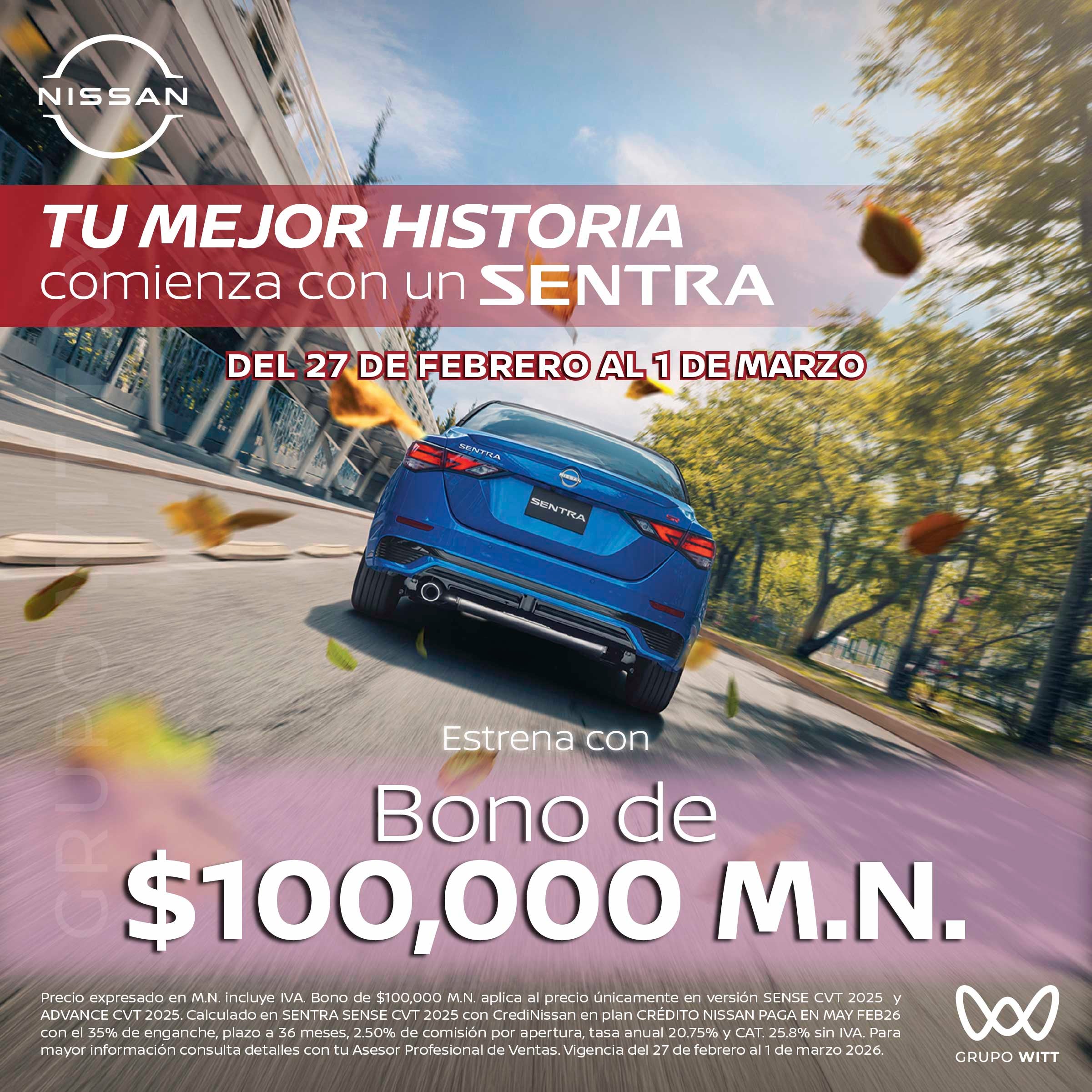 Precio expresado en M.N. incluye IVA. Bono de $100,000 M.N. aplica al precio únicamente en versión SENSE CVT 2025 y ADVANCE CVT 2025. Calculado en SENTRA SENSE CVT 2025 con CrediNissan en plan CRÉDITO NISSAN PAGA EN MAY FEB26 con el 35% de enganche, plazo a 36 meses, 2.50% de comisión por apertura, tasa anual 20.75% y CAT. 25.8% sin IVA. Paramayor información consulta detalles co tu Asesor Profesional de Ventas. Vigencia del 27 de febrero al 1 de marzo 2026.