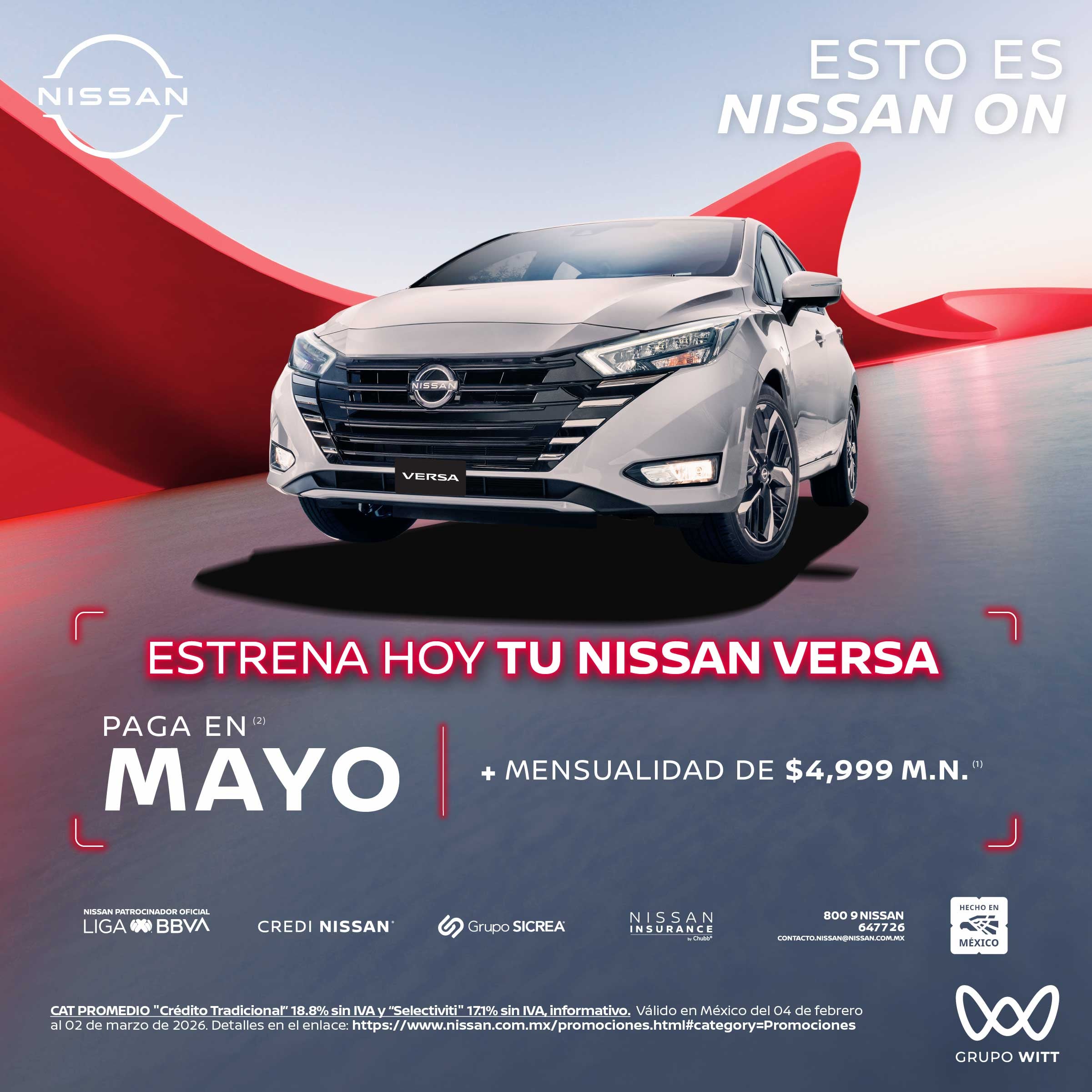 CAT PROMEDIO "Crédito Tradicional" 18.8% sin IVA y "Selectiviti" 17.1% sin IVA, informativo. Válido en México del 04 de febrero al 02 de marzo de 2026. Detalles en el enlace: https://www.nissan.com.mx/promociones.html#category=Promociones
