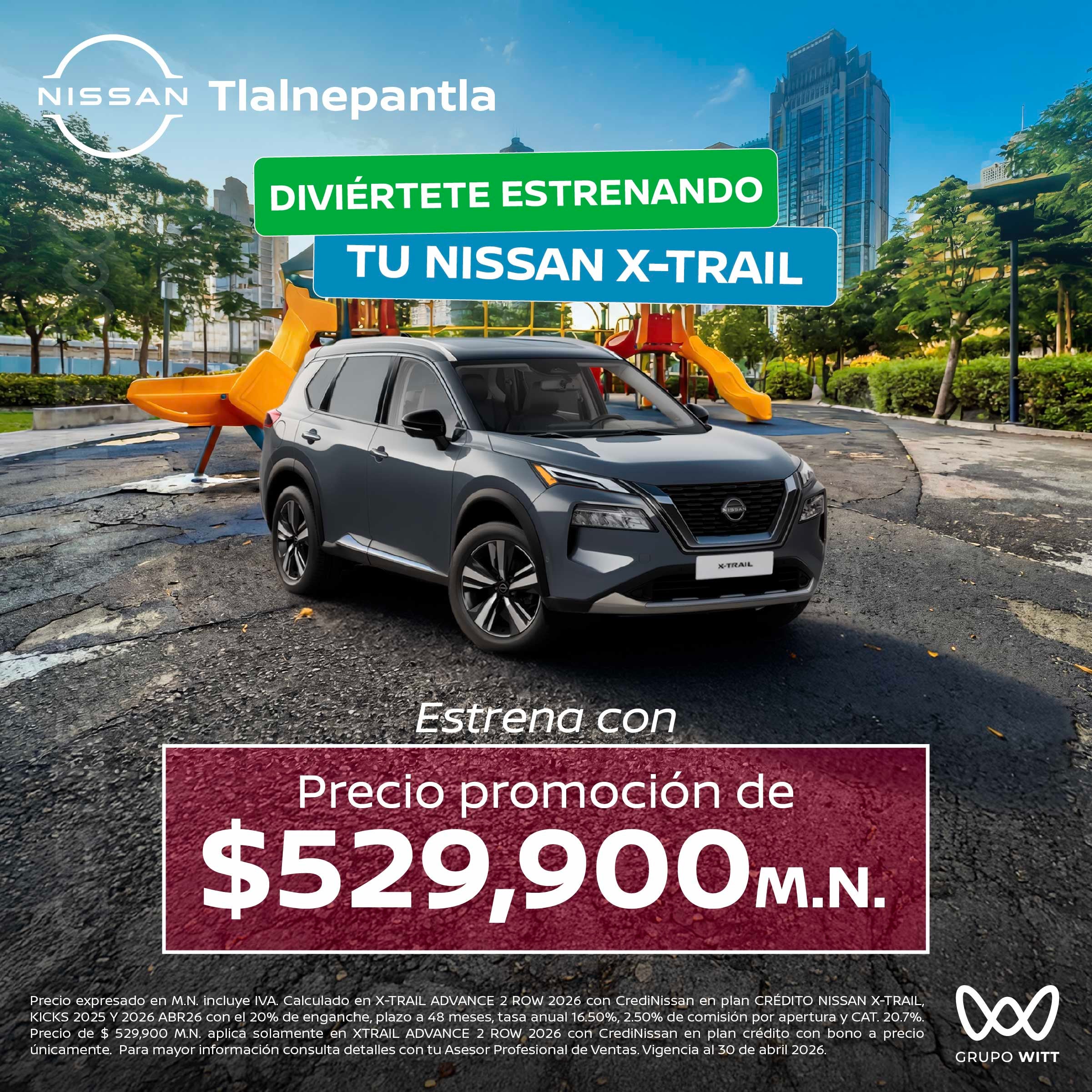 Precio expresado en M.N. incluye IVA. Calculado en X-TRAIL ADVANCE 2 ROW 2026 con CrediNissan en plan CRÉDITO NISSAN X-TRAIL, KICKS 2025 Y 2026 ABR26 con el 20% de enganche, plazo a 48 meses, tasa anual 16.50%, 2.50% de comisión por apertura y CAT. 20.7%. Precio de $ 529,900 M.N. aplica solamente en XTRAIL ADVANCE 2 ROW 2026 con CrediNissan en plan crédito con bono a precio únicamente. Para mayor información consulta detalles con tu Asesor Profesional de Ventas. Vigencia al 30 de abril 2026.