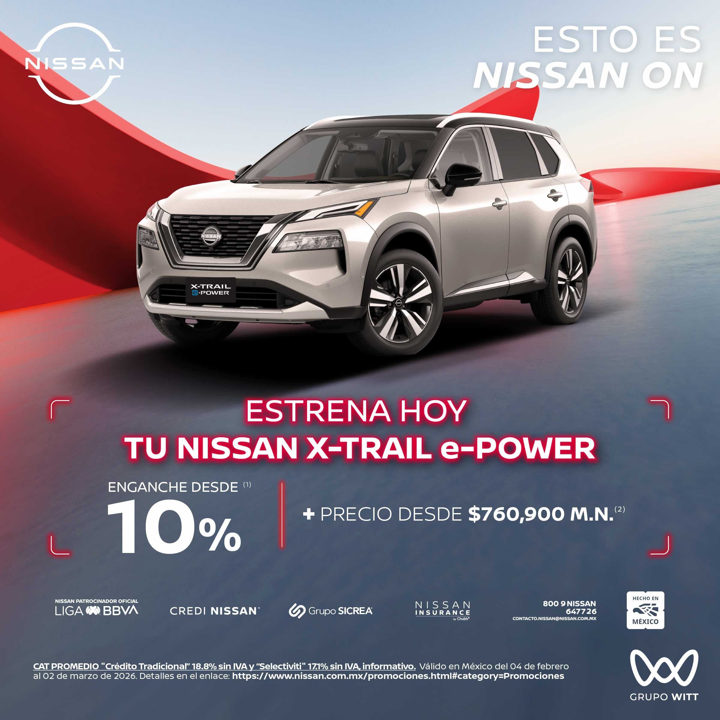 CAT PROMEDIO "Crédito Tradicional" 18.8% sin IVA y "Selectiviti" 17.1% sin IVA, informativo. Válido en México del 04 de febrero al 02 de marzo de 2026. Detalles en el enlace: https://www.nissan.com.mx/promociones.html#category=Promociones
