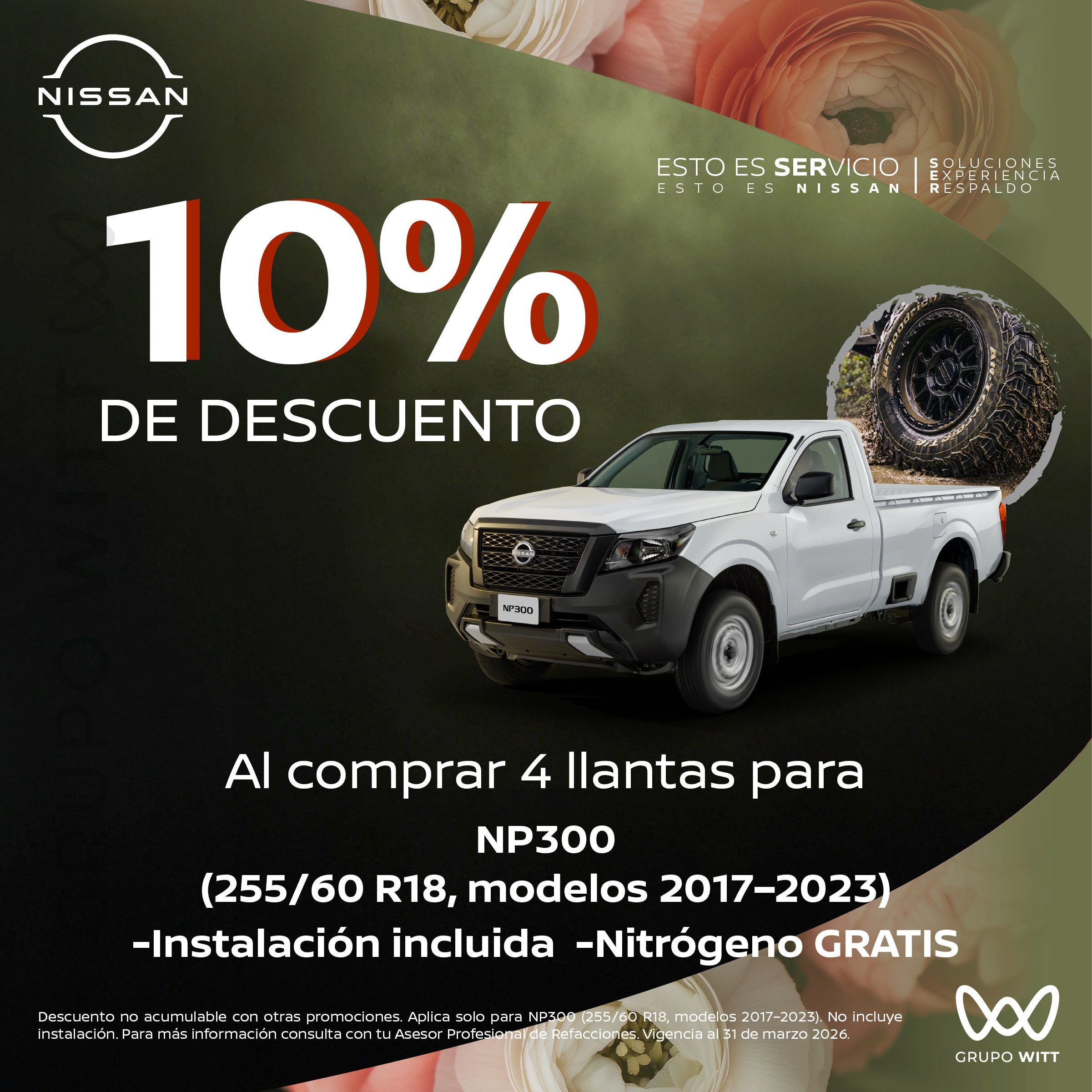 Descuento no acumulable con otras promociones. Aplica solo para NP300 (255/60 R18, modelos 2017-2023). No incluye instalación. Para más información consulta con tu Asesor Profesional de Refacciones. Vigencia al 31 de marzo 2026.