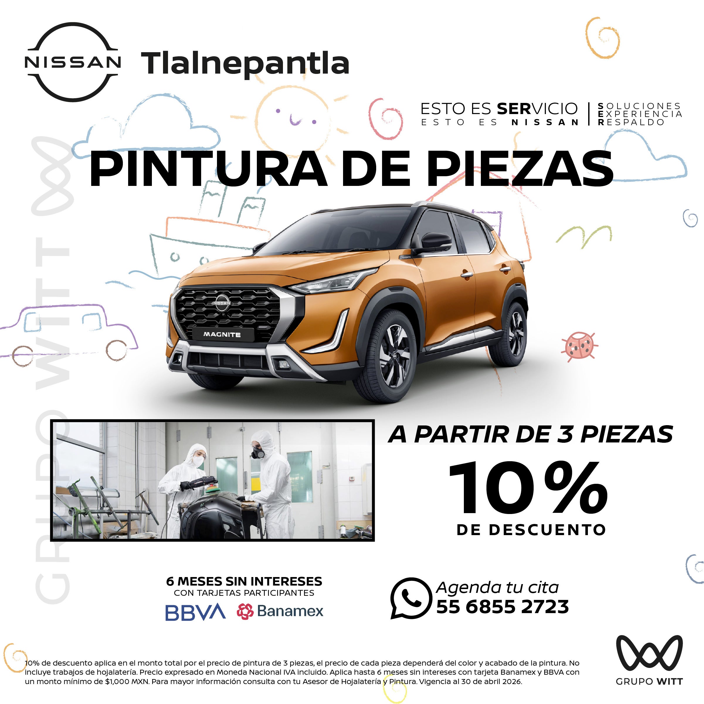 10% de descuento aplica en el monto total por el precio de pintura de 3 piezas, el precio de cada pieza dependerá del color y acabado de la pintura. No incluye trabajos de hojalatería. Precio expresado en Moneda Nacional IVA incluido. Aplica hasta 6 meses sin intereses con tarjeta Banamex y BBVA con un monto mínimo de $1,000 MXN. Para mayor información consulta con tu Asesor de Hojalatería y Pintura. Vigencia al 30 de abril 2026.