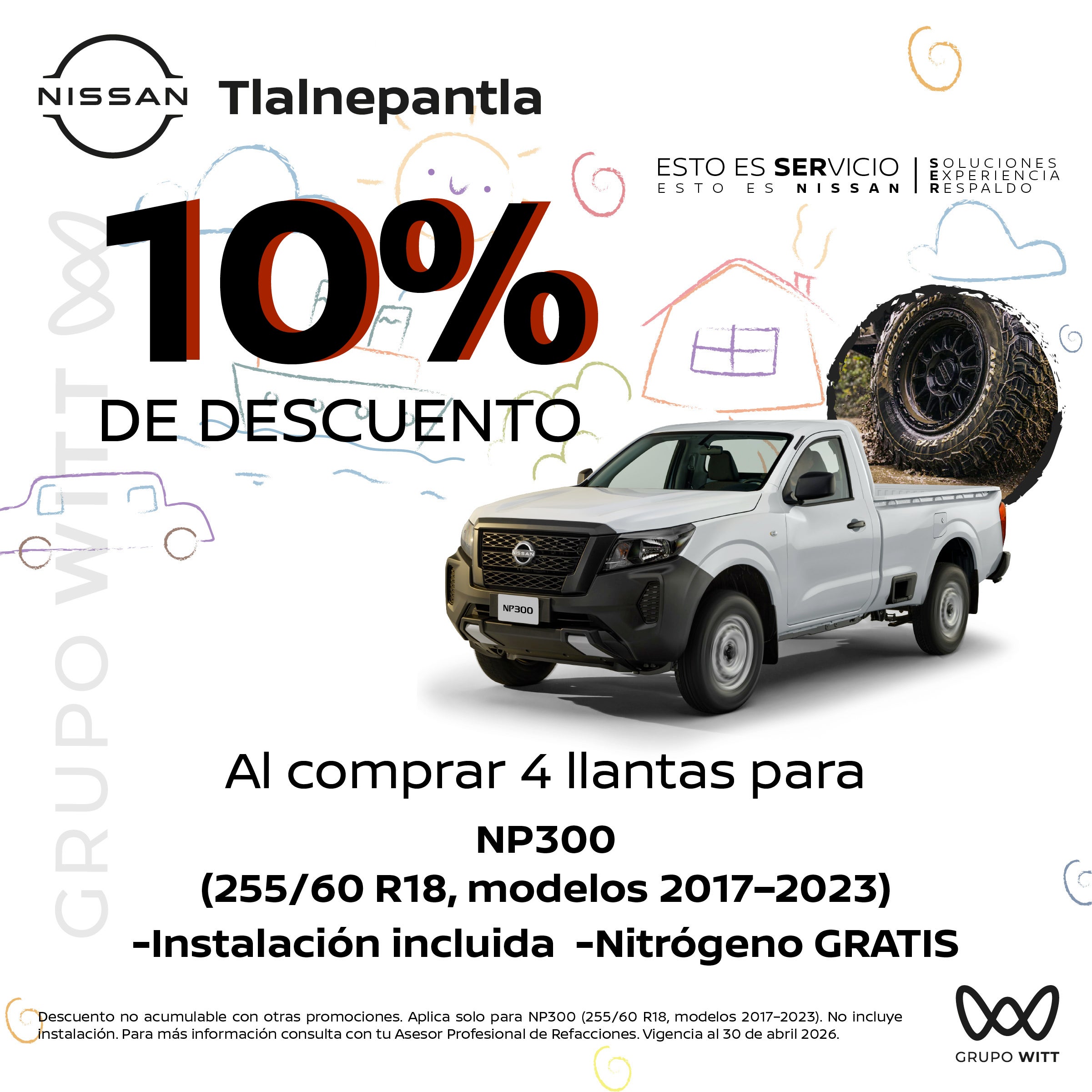 Descuento no acumulable con otras promociones. Aplica solo para NP300 (255/60 R18, modelos 2017-2023). No incluye instalación. Para más información consulta con tu Asesor Profesional de Refacciones. Vigencia al 30 de abril 2026.