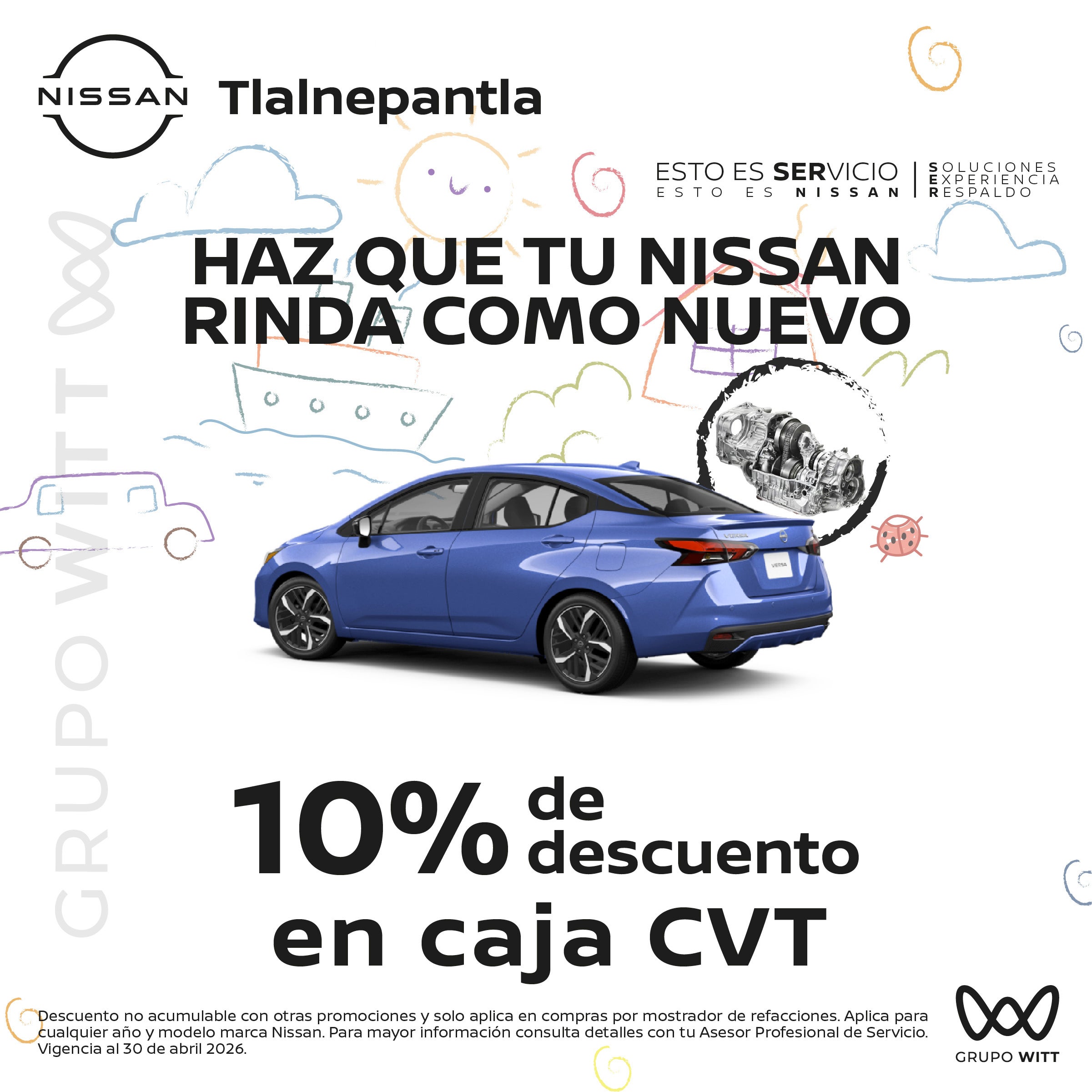 Descuento no acumulable con otras promociones y solo aplica en compras por mostrador de refacciones. Aplica para cualquier año y modelo marca Nissan. Para mayor información consulta detalles con tu Asesor Profesional de Servicio. Vigencia al 30 de abril 2026.