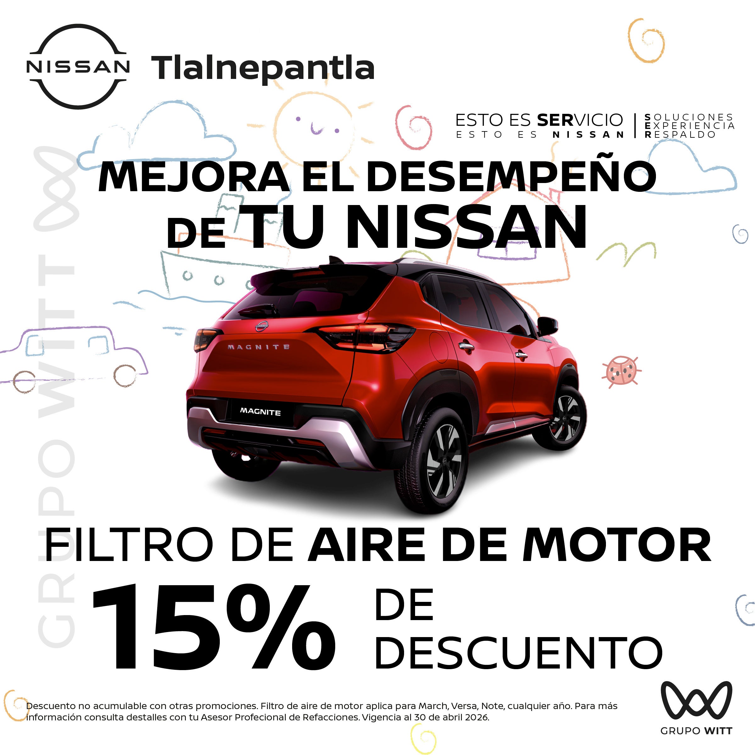 Descuento no acumulable con otras promociones. Filtro de aire de motor aplica para March, Versa, Note, cualquier año. Para más información consulta destalles con tu Asesor Profesional de Refacciones. Vigencia al 30 de abril 2026
