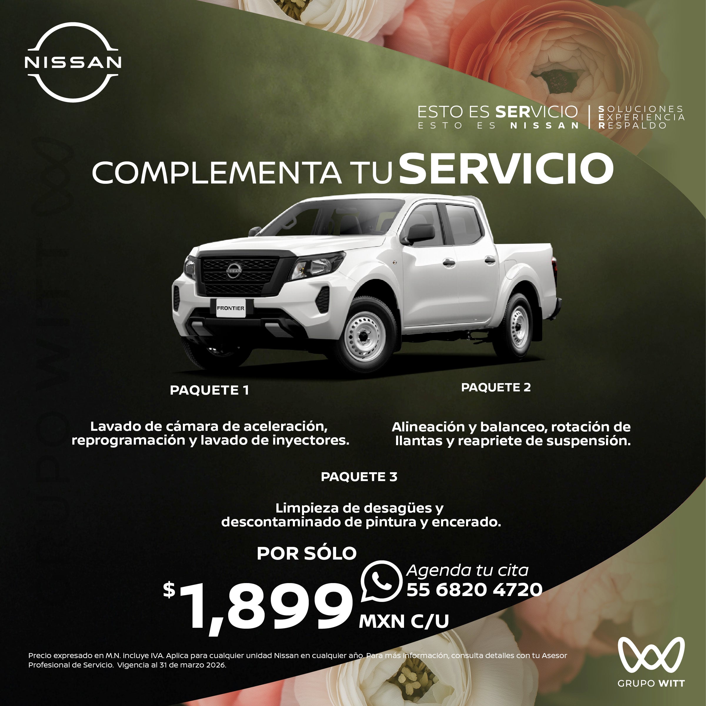 Precio expresado en M.N. incluye IVA. Aplica para cualquier unidad Nissan en cualquier ano. Para más información, consulta detalles con tu Asesor Profesional de Servicio. Vigencia al 31 de marzo 2026.
