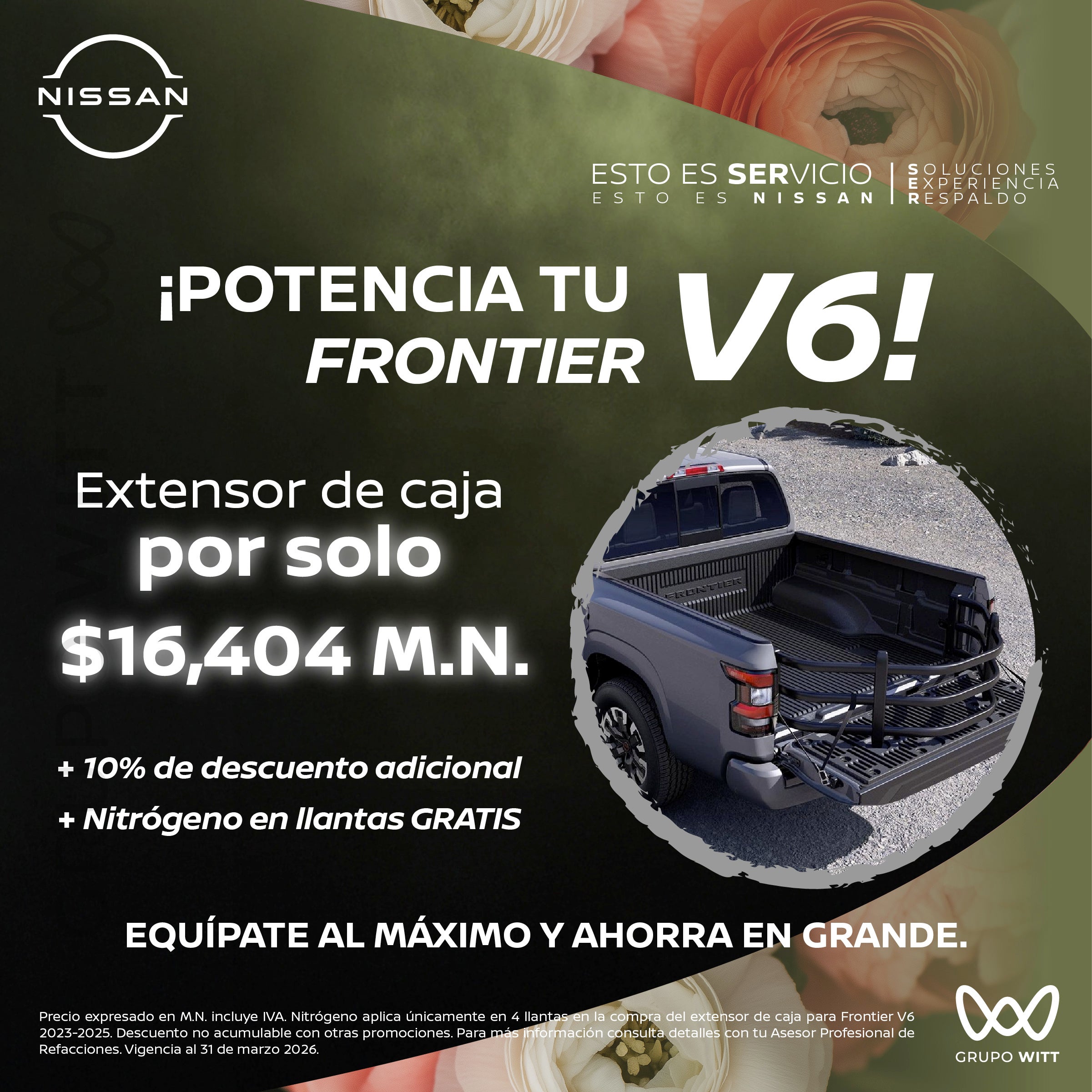 Precio expresado en M.N. incluye IVA. Nitrógeno aplica únicamente en 4 llantas en la compra del extensor de caja para Frontier V6 2023-2025. Descuento no acumulable con otras promociones. Para más información consulta detalles con tu Asesor Profesional de Refacciones. Vigencia al 31 de marzo 2026.