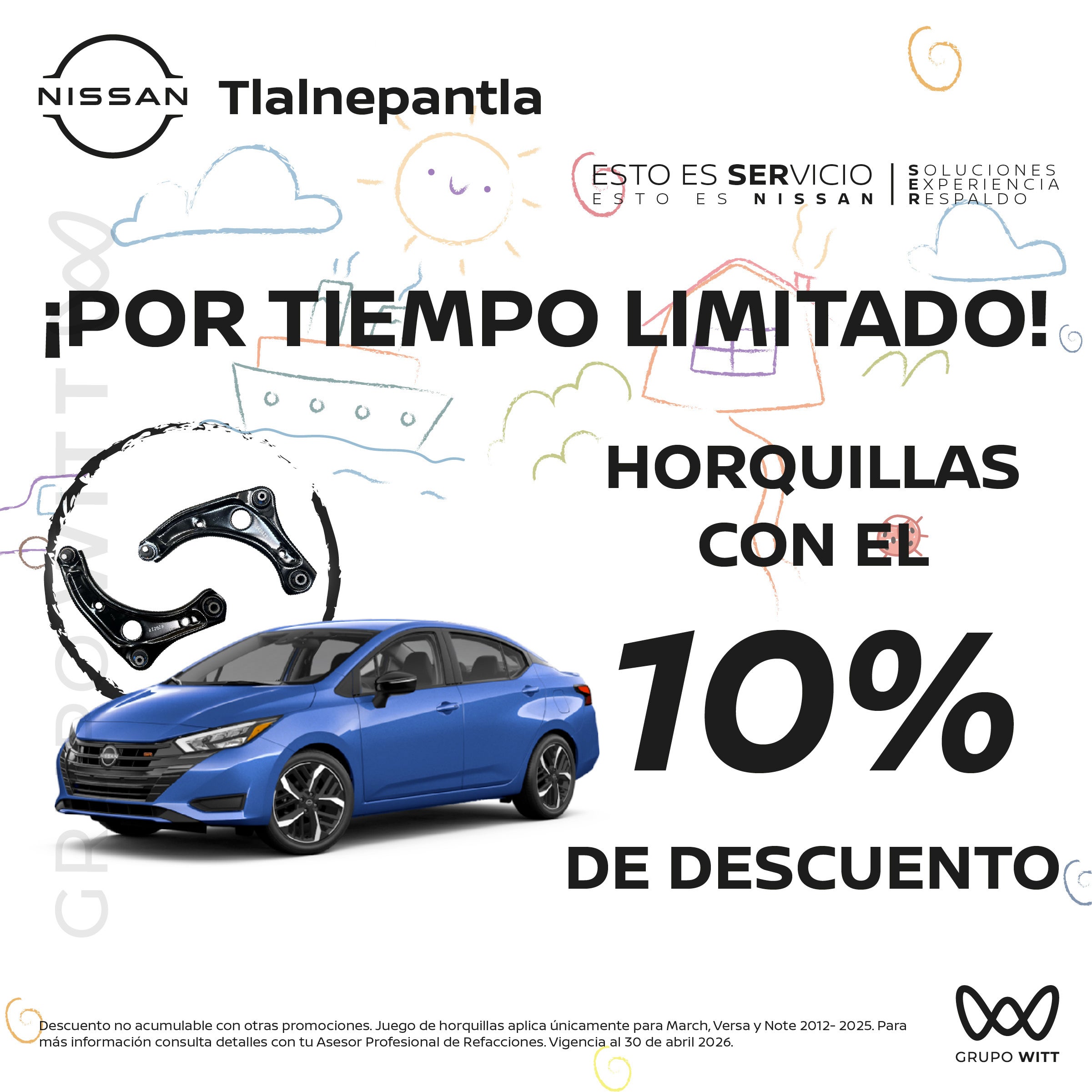 Descuento no acumulable con otras promociones. Juego de horquillas aplica únicamente para March, Versa y Note 2012- 2025. Para más información consulta detalles con tu Asesor Profesional de Refacciones. Vigencia al 30 de abril 2026.