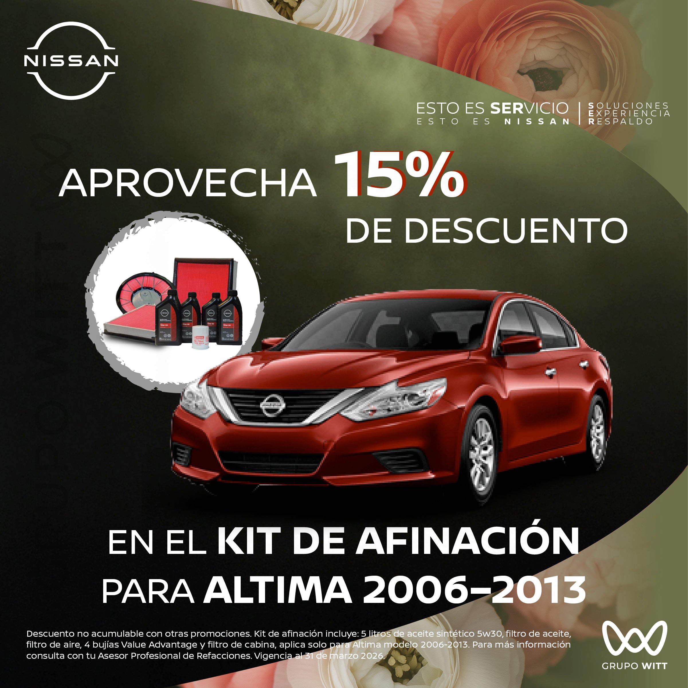 Descuento no acumulable con otras promociones. Kit de afinación incluye: 5 litros de aceite sintético 5w30, filtro de aceite, filtro de aire, 4 bujías Value Advantage y filtro de cabina, aplica solo para Altima modelo 2006-2013. Para más información consulta con tu Asesor Profesional de Refacciones. Vigencia al 31 de marzo 2026.