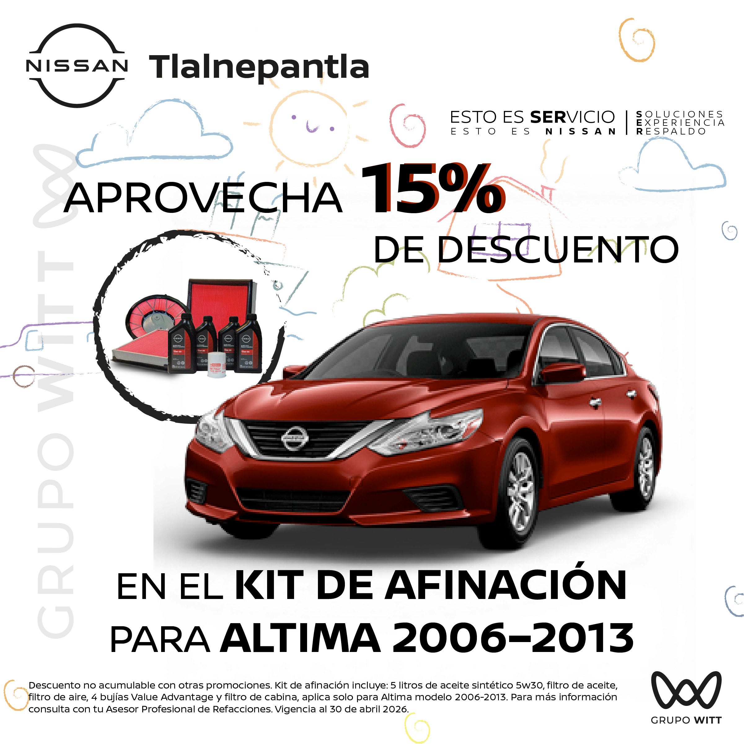 Descuento no acumulable con otras promociones. Kit de afinación incluye: 5 litros de aceite sintético 5w30, filtro de aceite, filtro de aire, 4 bujías Value Advantage y filtro de cabina, aplica solo para Altima modelo 2006-2013. Para más información consulta con tu Asesor Profesional de Refacciones. Vigencia al 30 de abril 2026.