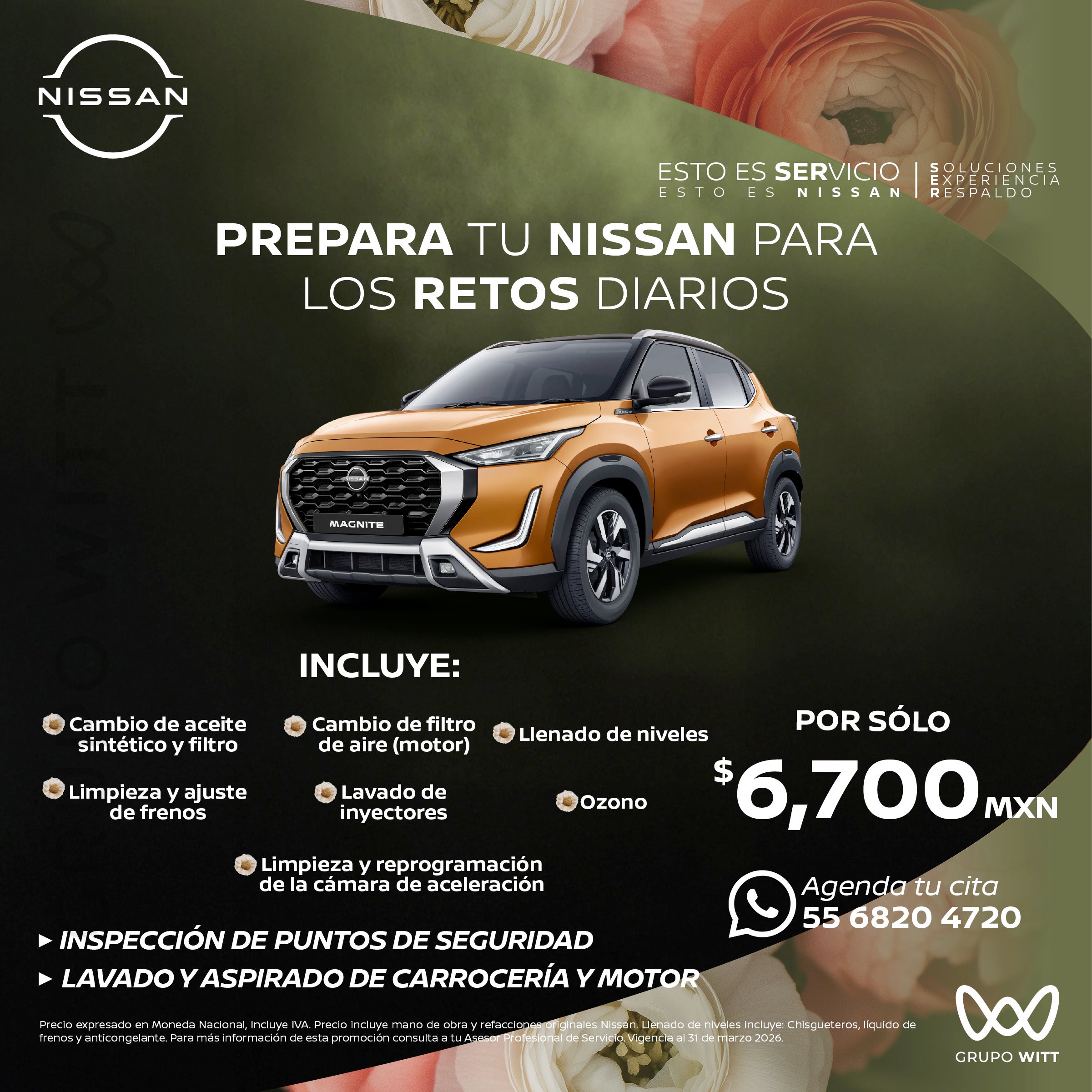 Precio expresado en Moneda Nacional, Incluye IVA. Precio incluye mano de obra y refacciones originales Nissan. Llenado de niveles incluye: Chisgueteros, líquido de frenos y anticongelante. Para más información de esta promoción consulta a tu Asesor Profesional de Servicio. Vigencia al 31 de marzo 2026.