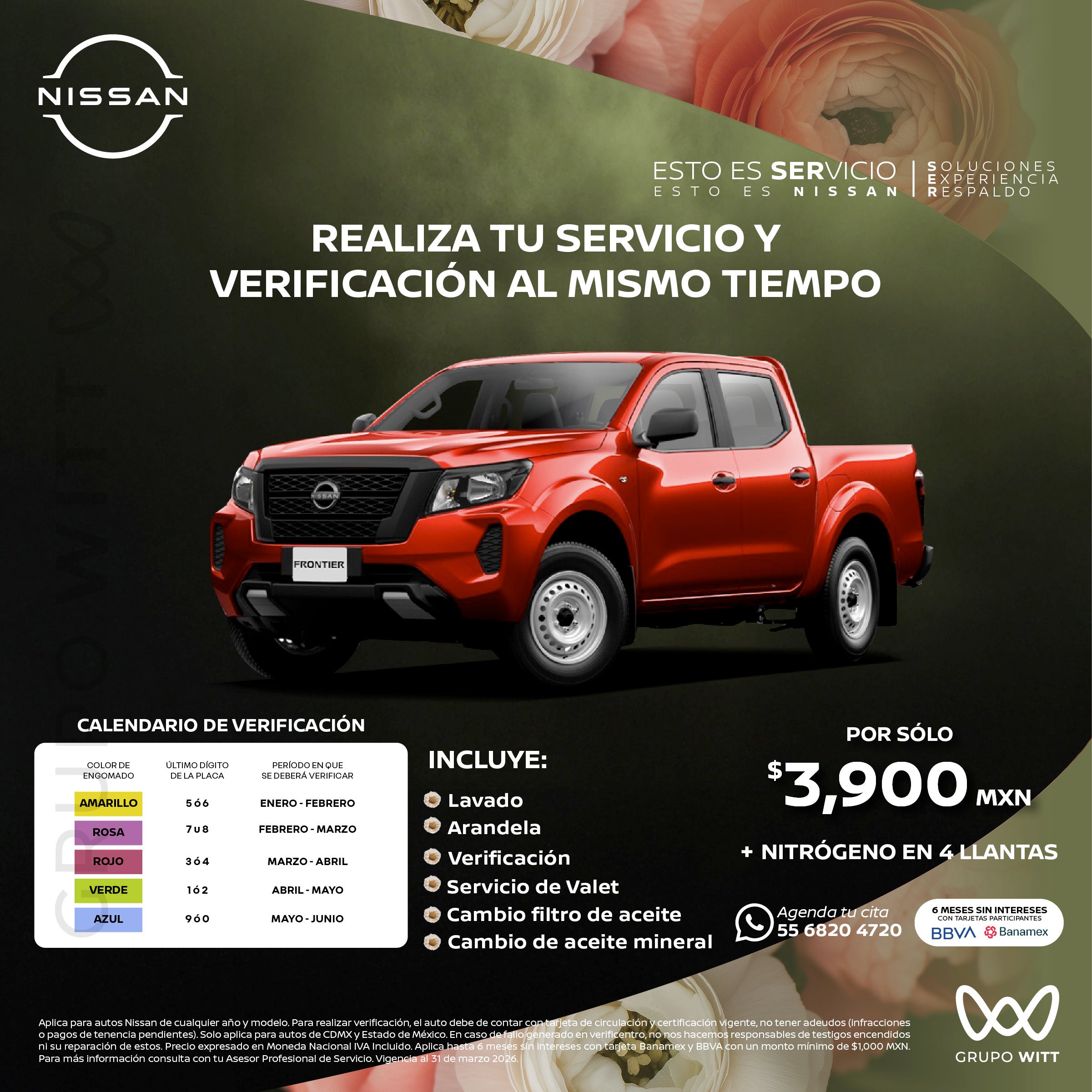 Aplica para autos Nissan de cualquier ano y modelo. Para realizar verificación, el auto debe de contar con tarjeta de circulación y certificación vigente, no tener adeudos (infracciones o pagos de tenencia pendientes). Solo aplica para autos de CDMX y Estado de México. En caso de fallo generado en verificentro, no nos hacemos responsables de testigos encendidos ni su reparación de estos. Precio expresado en Moneda Nacional IVA Incluido. Aplica hasta 6 meses sin Intereses con tarjeta Banamex y BBVA con un monto mínimo de $1,000 MXN. Para más Información consulta con tu Asesor Profesional de Servicio. Vigencia al 31 de marzo 2026.