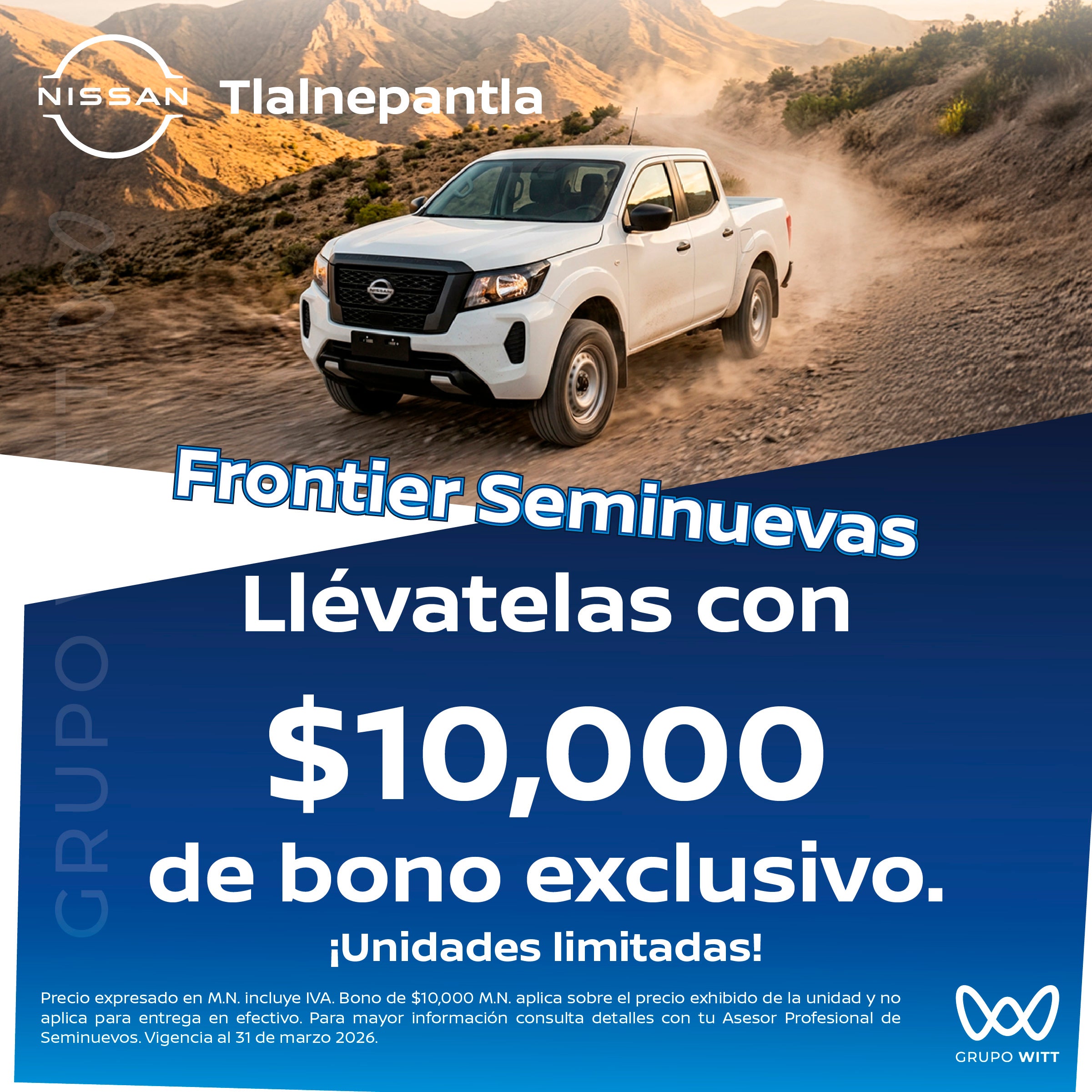 Precio expresado en M.N. incluye IVA. Bono de $10,000 M.N. aplica sobre el precio exhibido de la unidad y no aplica para entrega en efectivo. Para mayor información consulta detalles con tu Asesor Profesional de Seminuevos. Vigencia al 31 de marzo 2026.